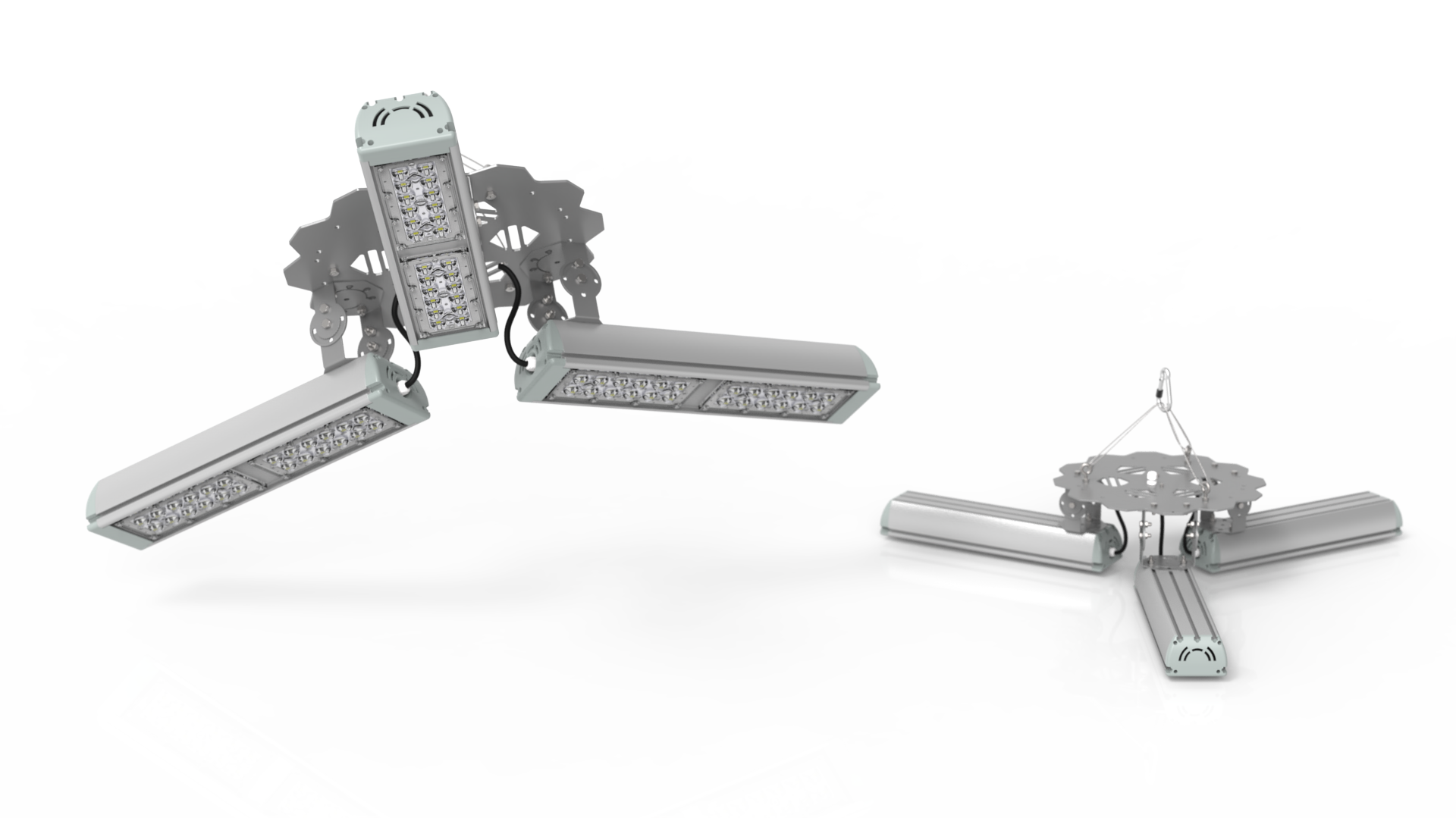 Подвесные промышленные светильники класса High-Bay с креплением на трос в 1 точке. Защита от 380В. Каждая секция имеет регулировку наклона.
