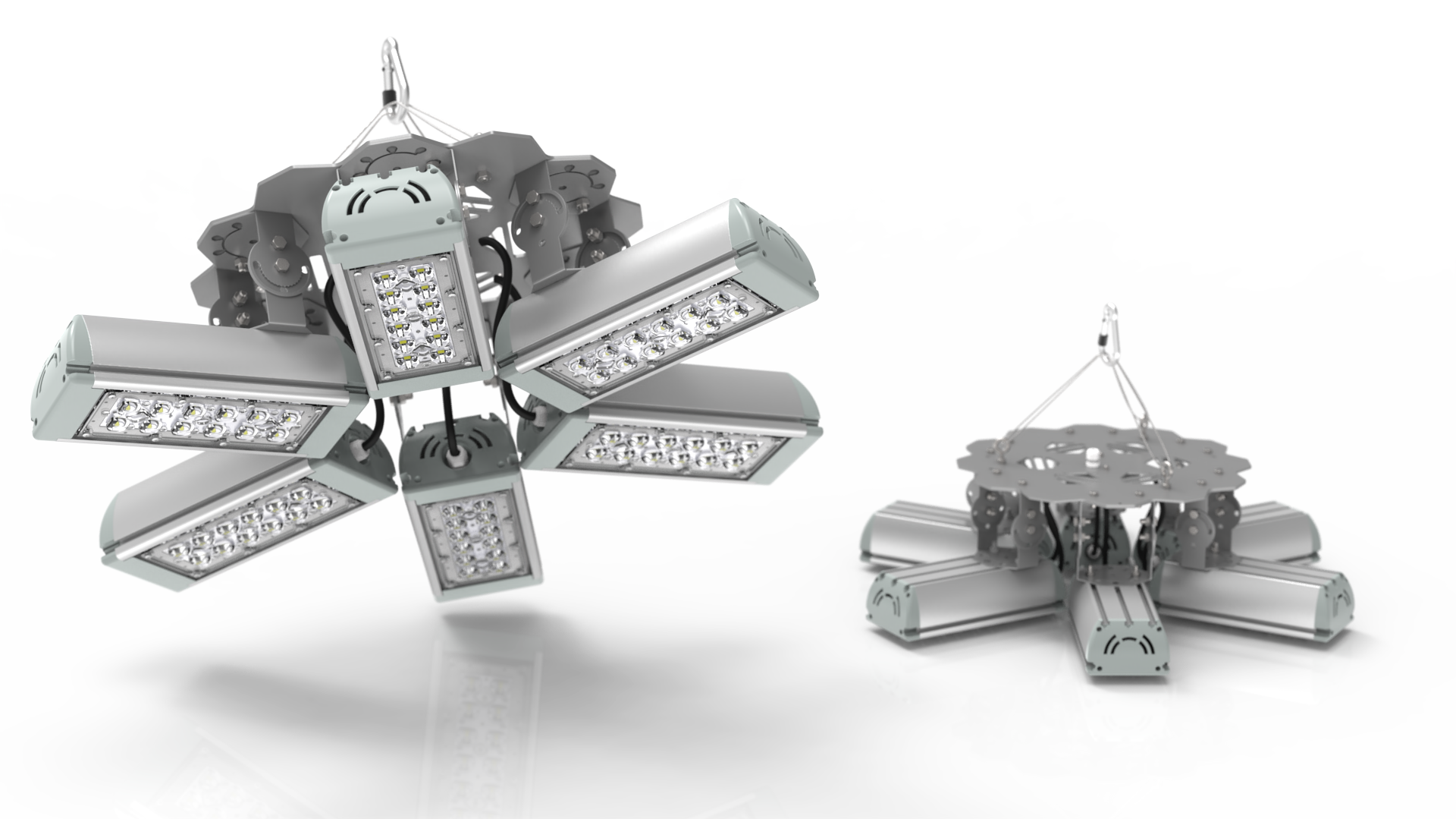 Подвесные промышленные светильники класса High-Bay с креплением на трос в 1 точке. Защита от 380В. Каждая секция имеет регулировку наклона.