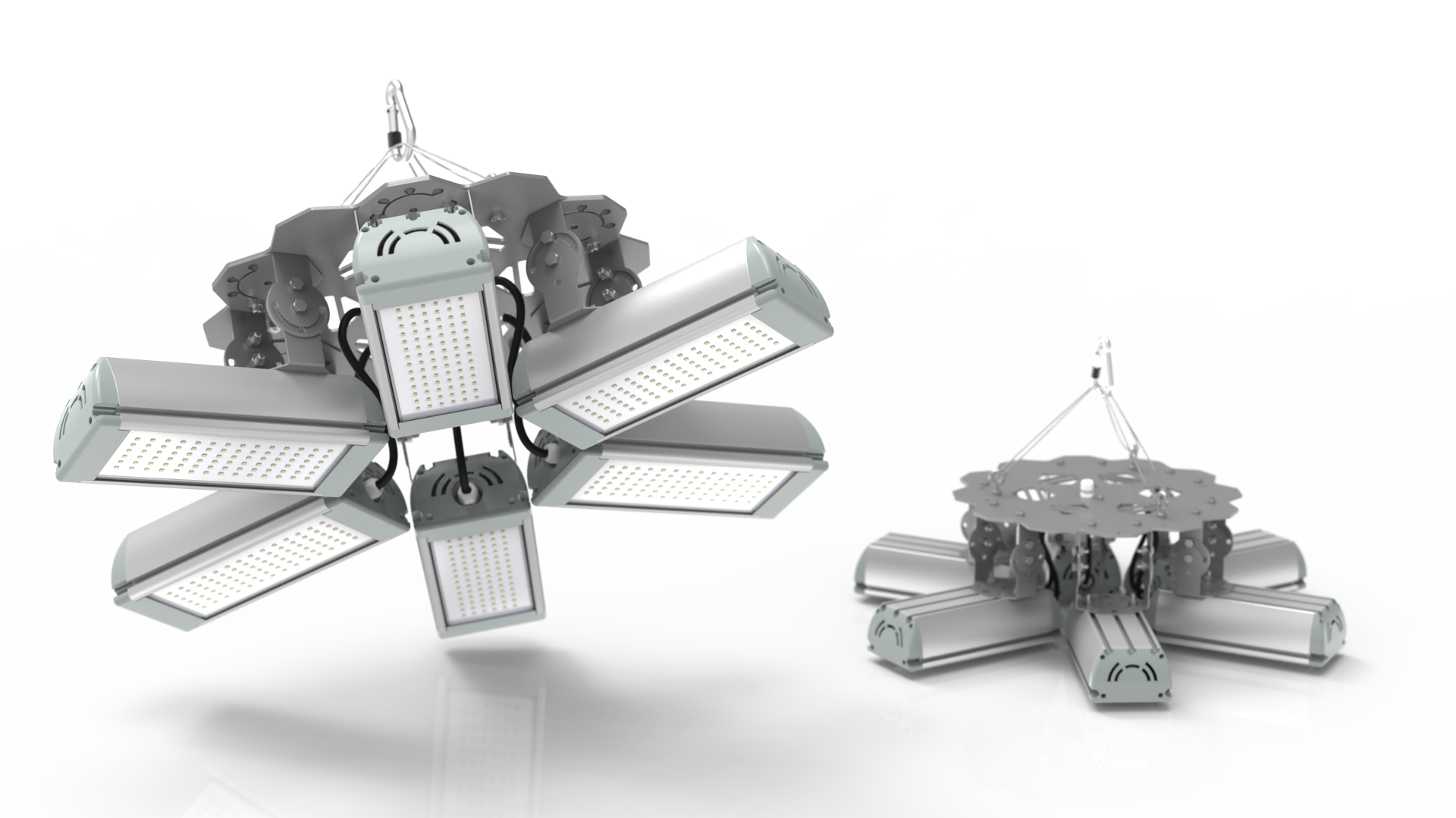Подвесные промышленные светильники класса High-Bay с креплением на трос в 1 точке. Защита от 380В. Каждая секция имеет регулировку наклона.