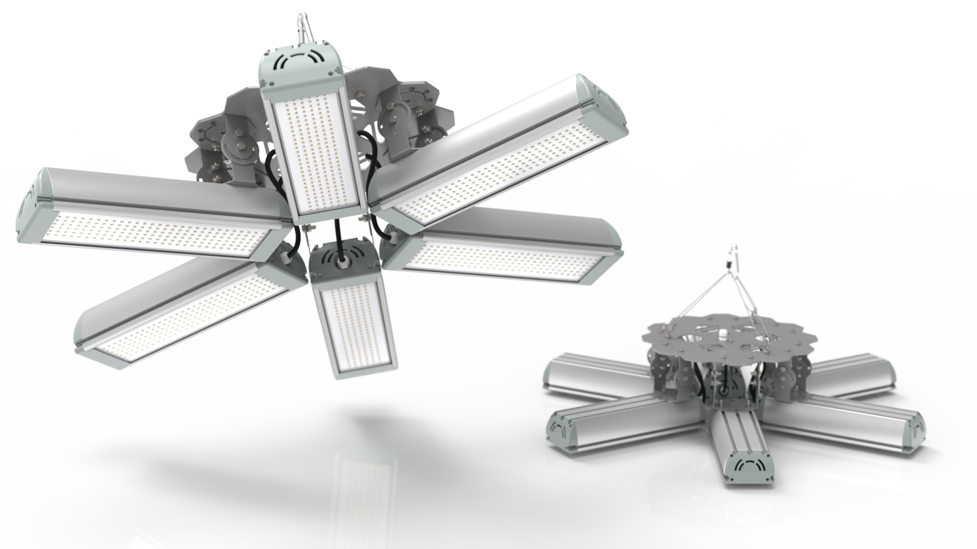 Подвесные промышленные светильники класса High-Bay с креплением на трос в 1 точке. Защита от 380В. Каждая секция имеет регулировку наклона.